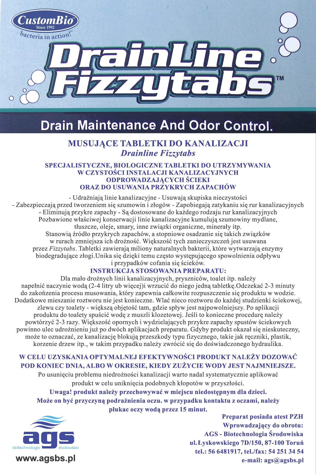 Bez odpowiedniej konserwacji linie kanalizacyjne kumulują szumowiny mydlane, tłuszcze, oleje, smary, minerały i inne związki organiczne. Takie związki stanowią przyczynę przykrych zapachów i stopniowo osadzają się w rurach redukując w ten sposób przepływ wody. Większość z tych zanieczyszczeń jest biodegradowalna przez Fizzytabs. Często bowiem, niekontrolowane zmniejszanie się światła rury powoduje spowolnieniu odpływu i występowanie przypadków cofania się ścieków.