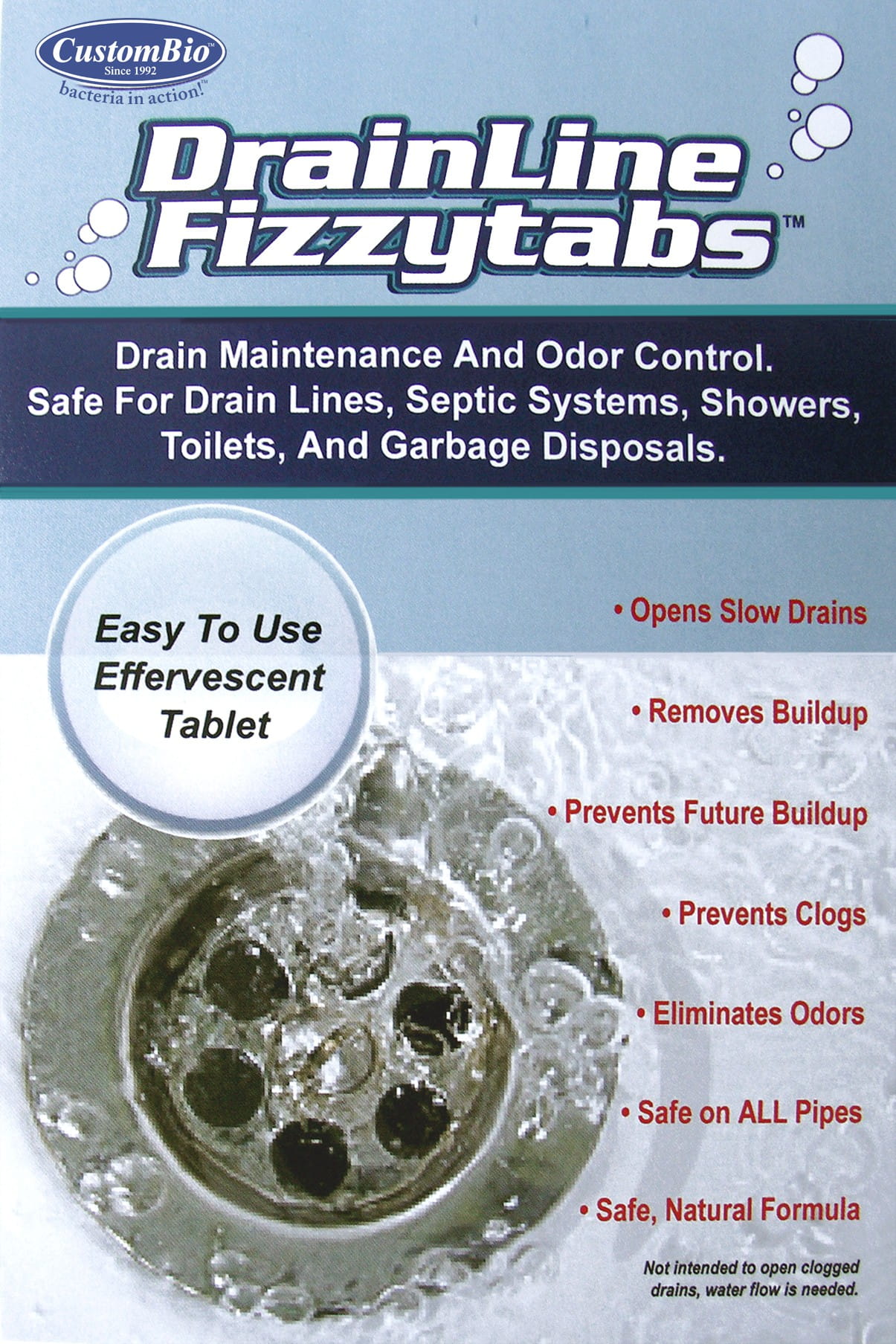 DrainLine Fizzytabs zawierają miliony naturalnych bakterii, które produkują enzymy biodegradujące kożuchy mydlane, tłuszcze, oleje, smary i minerały będące przyczyną redukcji średnicy rur. DrainLine Fizzytabs stopniowo udrażniają kanalizacje i zabezpieczają ją przed dalszym zatykaniem jak również eliminują nieprzyjemne zapachy.